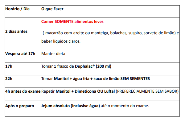 ( OBS – Recomenda-se a ingestão de quantidade adequada de líquidos claros — como água,