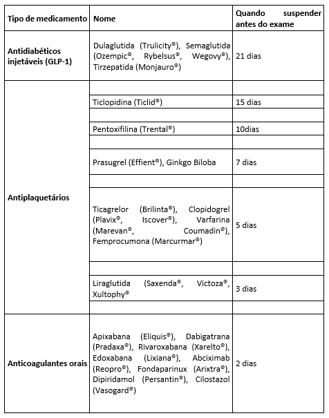 ● Hipoglicemiantes orais (diabetes) devem ser suspensos no dia do exame devido ao jejum prolongado.